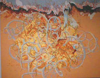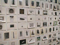 Go From Leonardo's landscapes based on cracks in plaster walls to Jean Arp's scattered paper collages, artists have always sought fresh visual forms by inventing systems that distance themselves from their creations. In today's art world, supersaturated with words, systems have another benefit: reams of readymade verbiage about the system make it easy to avoid talking about the work itself. At the CAM, the wall tags, catalog and available reference materials provide a blizzard of information about the artists' processes, and almost nothing about their works' actual effects. I won't waste space in this review regurgitating the artists' schpiels about how their pieces are made; this information is intentionally obfuscating, not illuminating. In this show, only Emma Kay's Shakespeare From Memory packs enough conceptual punch to avoid being buried in BS. Loren Madsen's Cost Price Index graphs economic data in polished wood. Elegant materials imply careful research, but it fails to add much to one's understanding of changing economic conditions and ends up looking like a giant wasp abdomen. The piece succeeds in depicting a dramatic price increase over a period of time, but in the end, Cost Price Index is more about woodworking than economics. Likewise, Madsen's Long Scroll doesn't say much about how Madsen has spent his days, despite a myriad of little calendar squares. Mark Lombardi's drawings combine the paranoia of a confirmed conspiracy theorist with the elegant draftsmanship of a frustrated architect. Typical of the conspiracy theory genre, the works rely on innuendo, not information. In one drawing we are told that a lot of people are connected to the Lippo Group, but not what they did, or whether they are guilty of anything. Like hapless news consumers we are given tantalizing headlines, but never get the real story. Matthew Ritchie builds complex tangles of graffiti-style marker moves, studded with comic book figures and cryptic pseudo-equations, all based on a complex, hermetic cosmology. Like Pokemon, Ritchie's world-system thrives on baroque complexity for its own sake, distracting criticism from the disappointingly dull surfaces and indifferent paint dabbing which make these pieces much better from a distance than close up. Steeped in the dusty, genteel aura of museology, William Steen's The Master File presents a trophy wall of file cards from the archives of The Menil Collection. On each card, a photo of an artwork is isolated, standardized, and displayed, becoming a trading card to be arranged, compared, hoarded. Steen's piece has the pride of vicarious ownership shared by museum employees everywhere. Emma Kay's subject is herself. Writing down all she can remember of shared cultural icons like The Bible or Shakespeare's plays, she allows us to compare our knowledge with hers, laughing at her funny mistakes where we know better, enjoying a sheepish dumb-and-dumber camaraderie where we're both ignorant. Together we English-speakers trace out the contours of shared culture, confirming our sense of identity by comparing our education and backgrounds. Kay's pieces are a rare triumph of text art: I actually read several of her involved panels, despite their minimal visual interest. The tongue in cheek Shakespeare from Memory panels are the best. Bible List, a large panel of nouns abstracted from the bible, is too contrived to be funny.