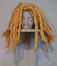 Tire Iron #14 6/7/01 Lauren Kelley: Shields Usually it's easy to see where an artist is coming from; good work states the artist's viewpoint clearly, bad work mostly falls into some recognizable category. Parody is the exception. Its strength is in deception; on making you believe one thing right up until the punch line, when suddenly the whole thing is cast in a new light. With Lauren Kelley's Shields show at DiverseWorks Subspace I'm stuck: I can't find the right punch line, yet it's difficult to believe there isn't one. It's either a screamingly funny parody of African American feminist art, or so crude it stretches belief. It would be easy to email the artist and ask, but I'm not going to; the most interesting thing about the show is the questions it raises, whether intentionally or by accident. A row of outrŽ wigs are displayed on lavender shelves as if in a funky hair salon. Elaborate yet clumsy, each wig is a conglomeration of iconic objects, some specifically African-American, some more generally feminine: black power hair picks, fried chicken, fake nails, bubblegum, rice. The plywood shelves and life-cast heads that the wigs rest on are so poorly crafted they verge on folk art, yet retain curious hints of sophistication: rather than resting on their necks, the heads are cut off at the chin or lips, recalling both Benin altar heads nearly smothered in jewelry, or John the Baptist's head on a plate. The wigs themselves are god-awful clumps of resin, but the plastic fried chicken legs do an amazing job of simulating the real thing. The video is no help. A series of young women strike self-conscious poses as they model the outrageous wigs, wetting their lip gloss and making eye contact in what is either a grotesque parody of commercial advertising, or just grotesque amateur modeling. Corny commands like "Don't gnaw on my brain," "Use your teeth" and "Don't put me on a plate" are superimposed across the screen either a wicked send-up of the quasi-logical rhetoric of political action, or just quasi-logical political rhetoric. All set against a light, jazzy soundtrack. It's nearly seamless. Searching for the giveaway I couldn't find in the work itself, I resorted to Kelley's resume. No folk artist, Kelley has an MFA and BFA from prestigious art schools. I guess she's black, although her resume doesn't mention it; it's almost impossible to imagine a non-African-American artist daring to tackle this type of content. Kelley's work flirts with trite messages on gender and race while mocking them. The ambivalence of her mixed messages speaks volumes about the complex, contradictory motives that drive and derail contemporary African-American art. It's not a strictly serious comment on hairstyle as an expression of African-American women's identity, nor simply an ironic comment about the overuse of such stereotypical ideas. The wigs are funny- no doubt about that. You can't overturn a bucket of fried chicken on someone's head without a laugh; but what am I laughing at? The artist, women with outlandish hairstyles, or the current state of African-American feminist art?
