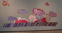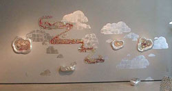 Overall, the show is crowded and uneven. The unframed cast resin reliefs like Slide, Cascade, Target, and Montezuma are the strongest. The shimmery, resin-impreganted fabric trees of Sai Kee look promising, but combine awkwardly with the glitter-brick road they stand behind. Likewise, the resin splashes of Waterfall have little to do with the central standing form of trailing bricks. Panda, the lone freestanding floor lump, hints at a direction that the show could have gone, but didn't. The two large-scale wall installations fight one another, and both seem out of step with Waterfall, a simpler, more materials-oriented floor piece that lies between them. The silver-leaf clouds that paper the walls and windows struggle to bring the many disparate pieces in the show together, but are not quite enough.