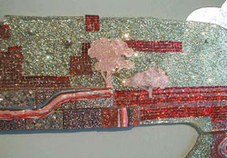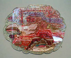 Harnischfeger's works balance campy glitz and toylike fun. Intricate but not fussy, the pieces play sublime aspirations against playfully low-tech manufacture. Irregular slabs of cast resin are clogged with a conglomeration of sequins, glitter, iridescent paint, fabric, and faux pearls in a sort of super-decoupage. Occasionally her casual craft falters; the bulky, silver-leafed basins and frames that overwhelm several of her tableaus are too smooth to be faux rock formations, too cruddy to be sublime silver bubbles.